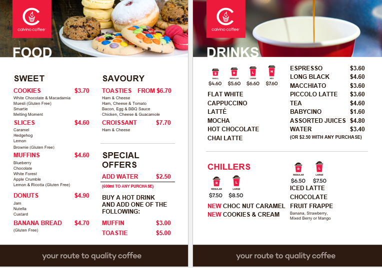 The menu at Calvino Coffee Wallan offers a selection of coffee-based drinks, light savoury options, and chilled beverages suitable for breakfast, coffee breaks, or light meals. Visitors can expect a range of hot drinks including traditional espresso varieties such as Flat White, Cappuccino, Latté, Mocha, Espresso, Long Black, Macchiato, Piccolo Latte, as well as Hot Chocolate, Chai Latte, and various teas. Non-coffee options include Babycino, assorted juices, and water.